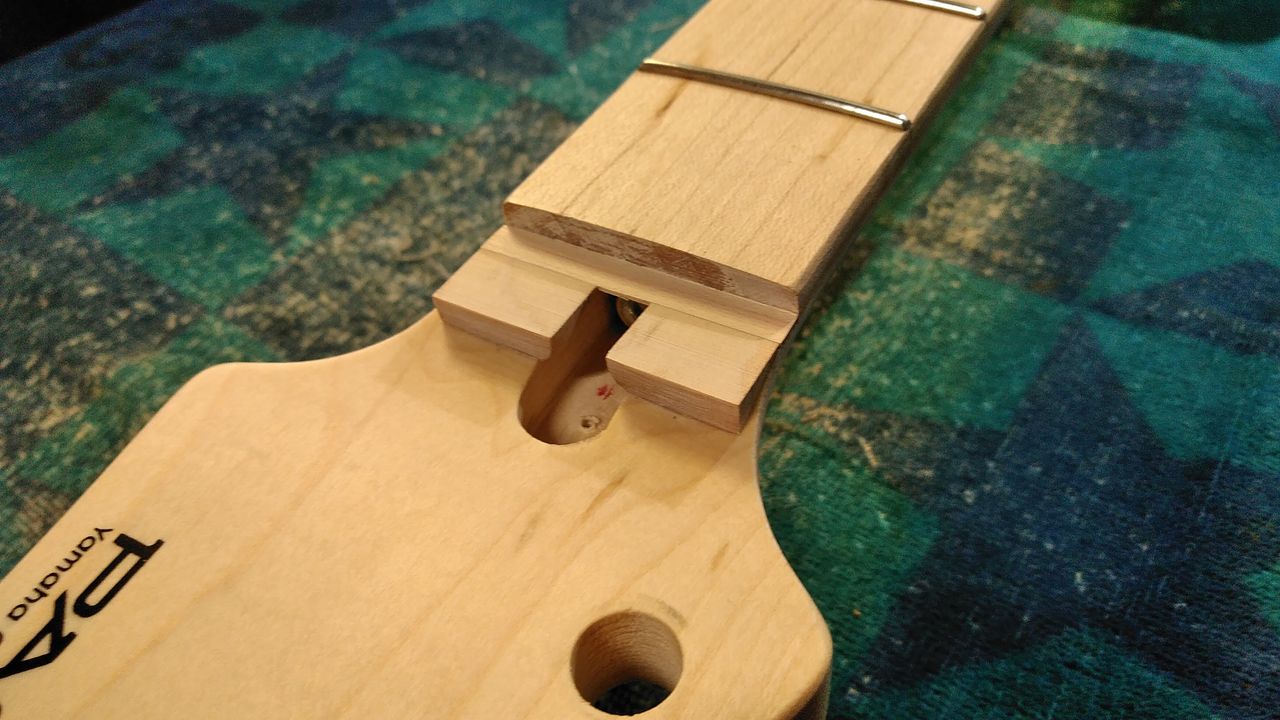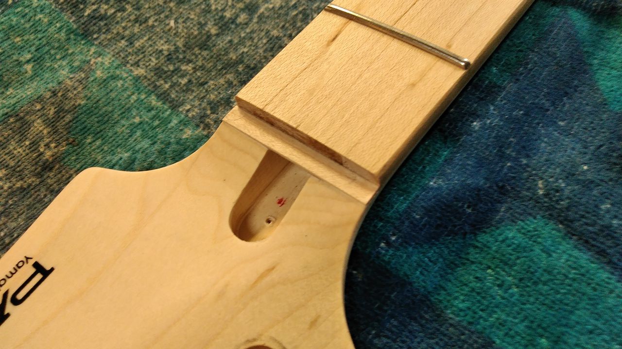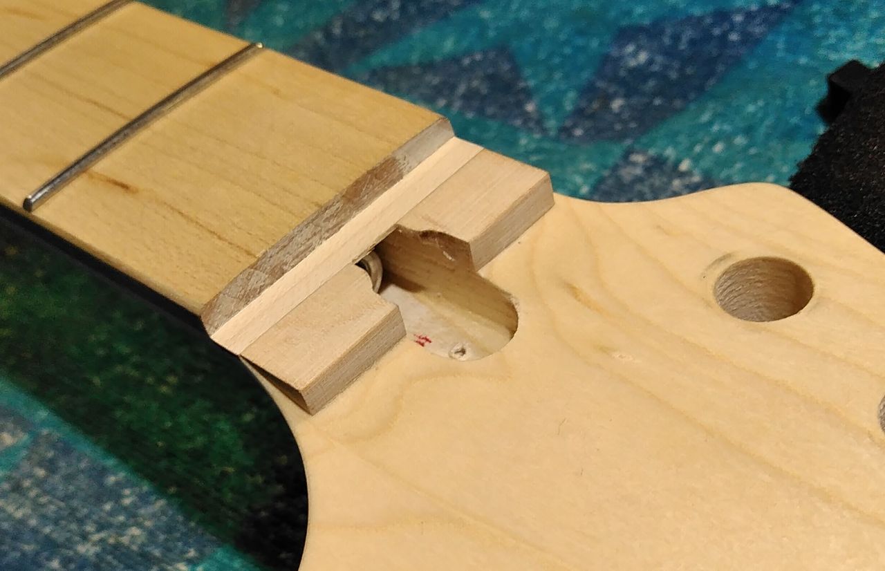 ひとまず元のナットが収まっていた所が一段落とし込まれているのでメイプルの突き板を貼ります。