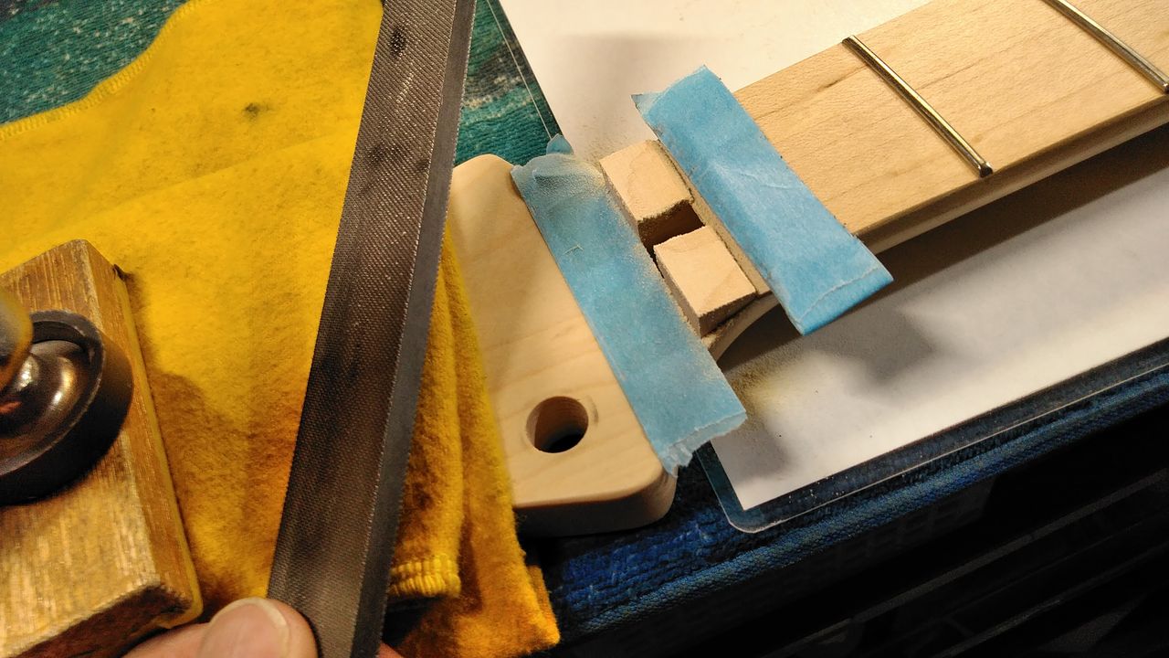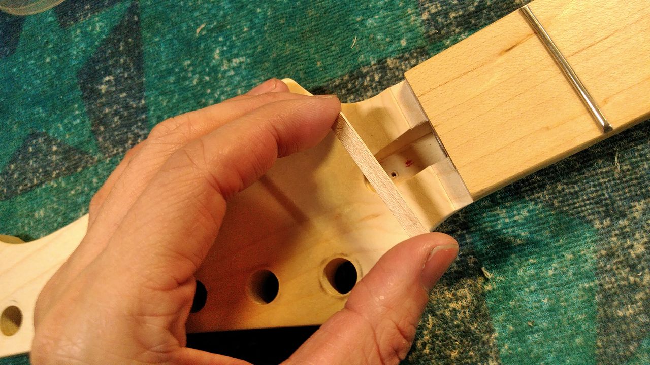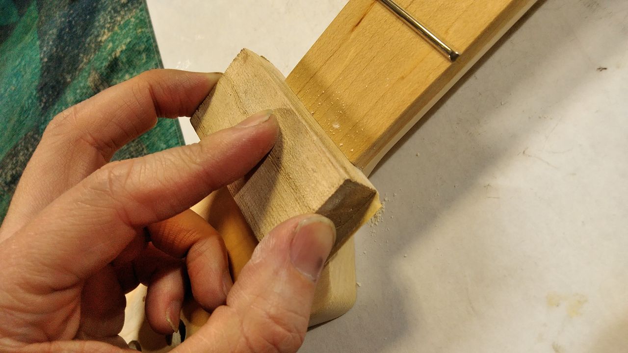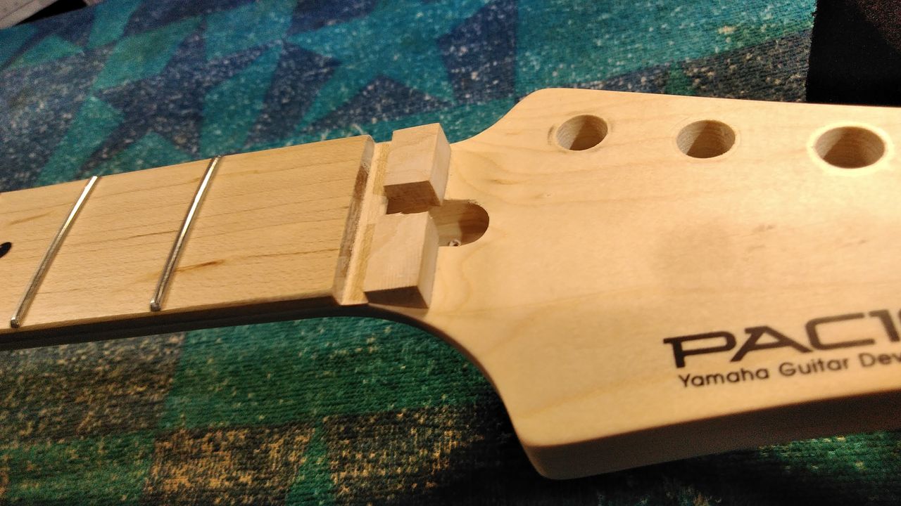ひとまず元のナットが収まっていた所が一段落とし込まれているのでメイプルの突き板を貼ります。