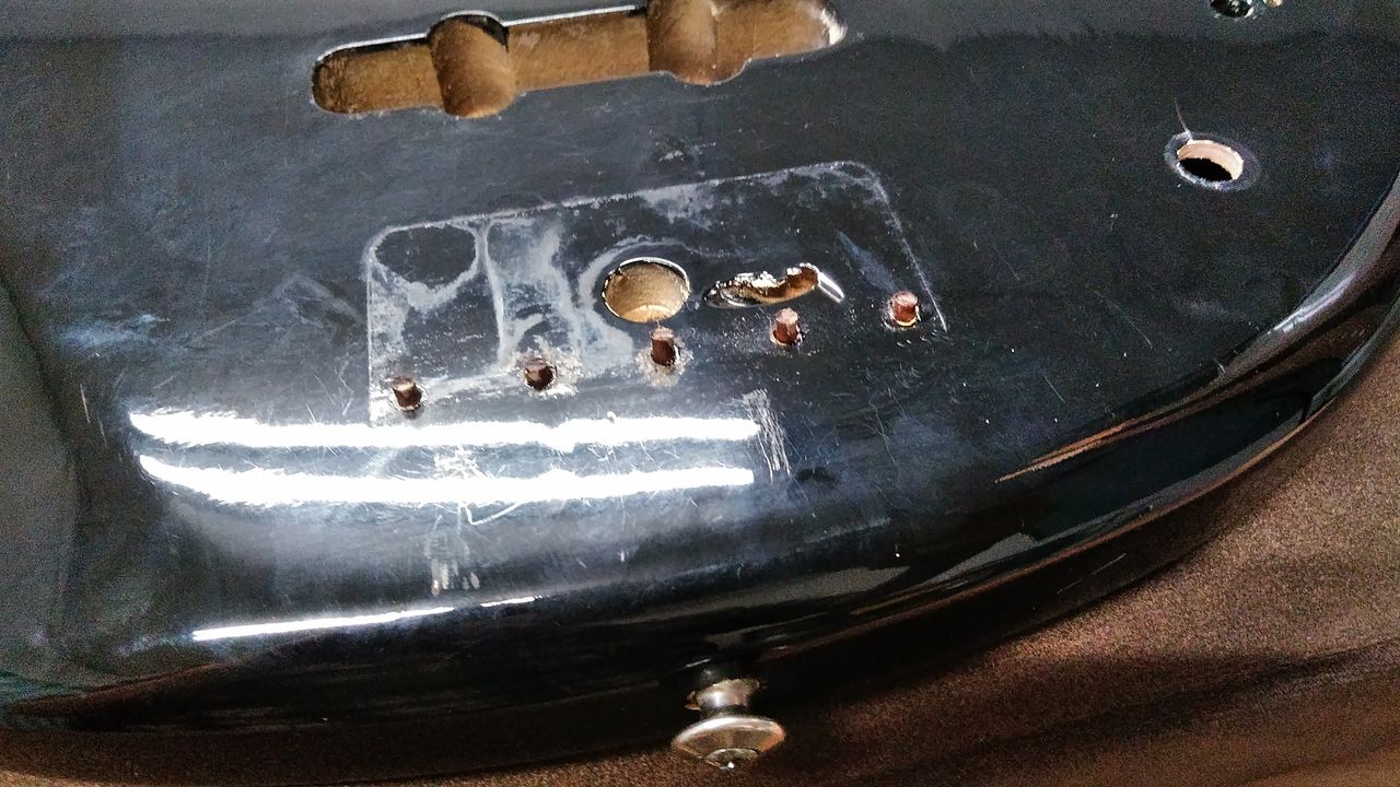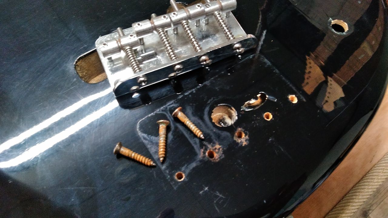 トレモロを固定するネジの穴開けは本来かなり高い精度が要求されるのですが、生産コストの都合でこれが何ともテキトーに済まされているものが少なくありません。