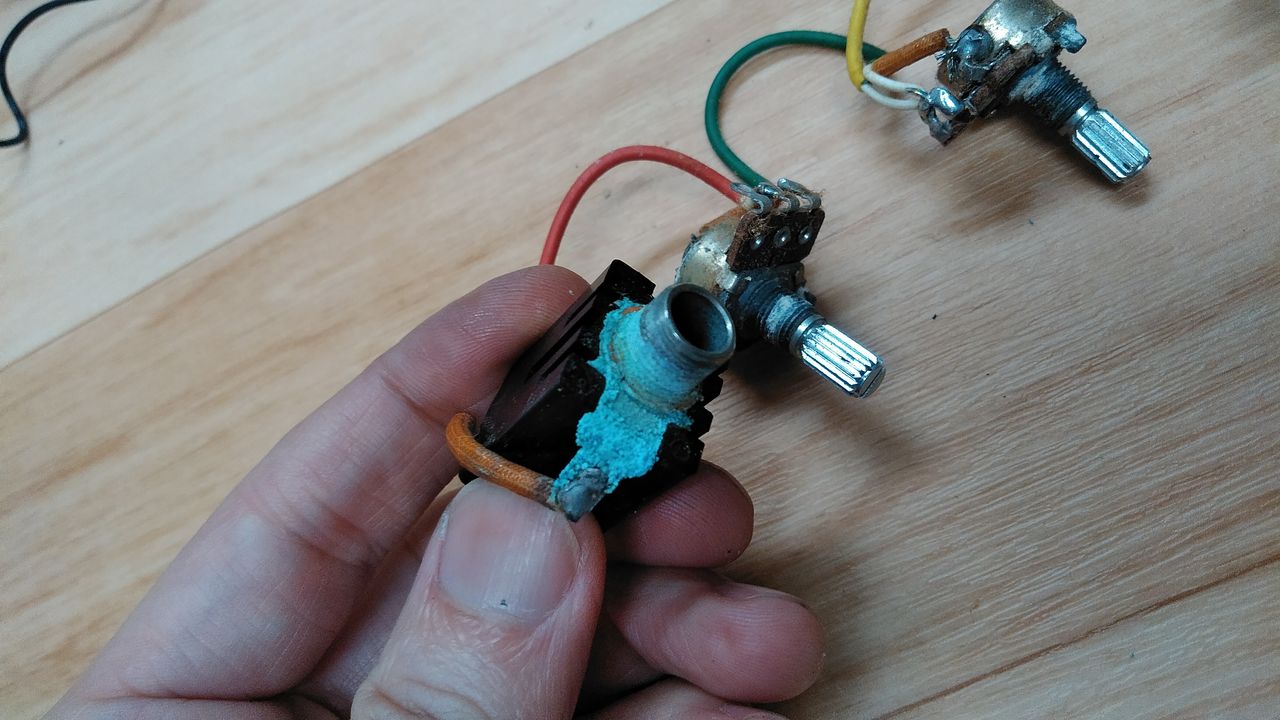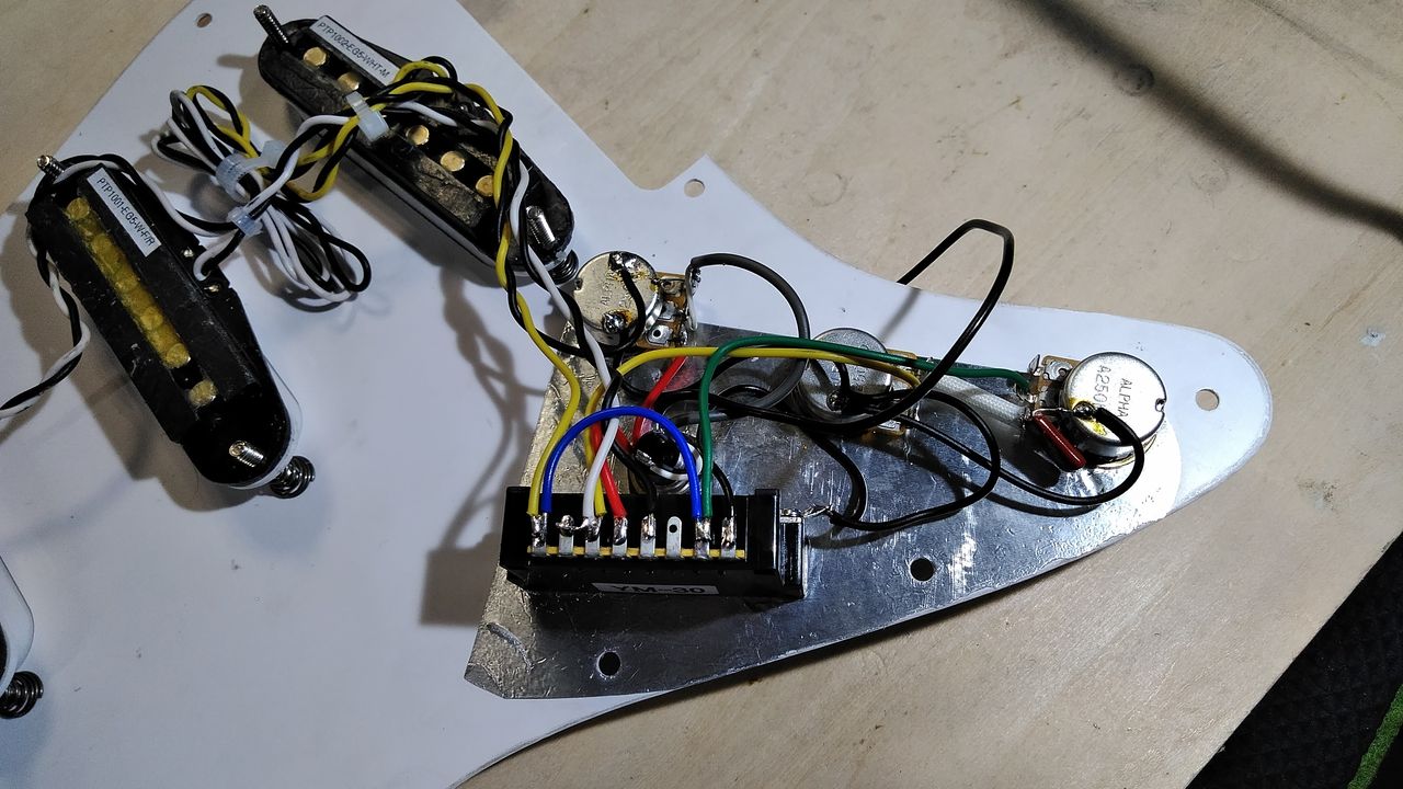 ストラトのパワー不足に困っていて、でもノーマルのPUは活かしたいという方におすすめのモディファイです。(また元に戻す事もあるかも知れないからPUの線は切らずに束ねておく)