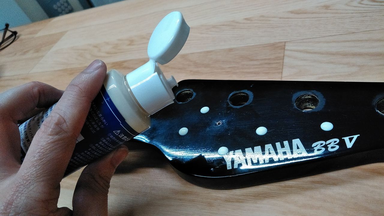今はドレメルのおかげでこの作業のスピードは格段に向上しました。使っているコンパウンドはヤマハのピアノ用です。色々試しましたが現時点ではコレが最強。