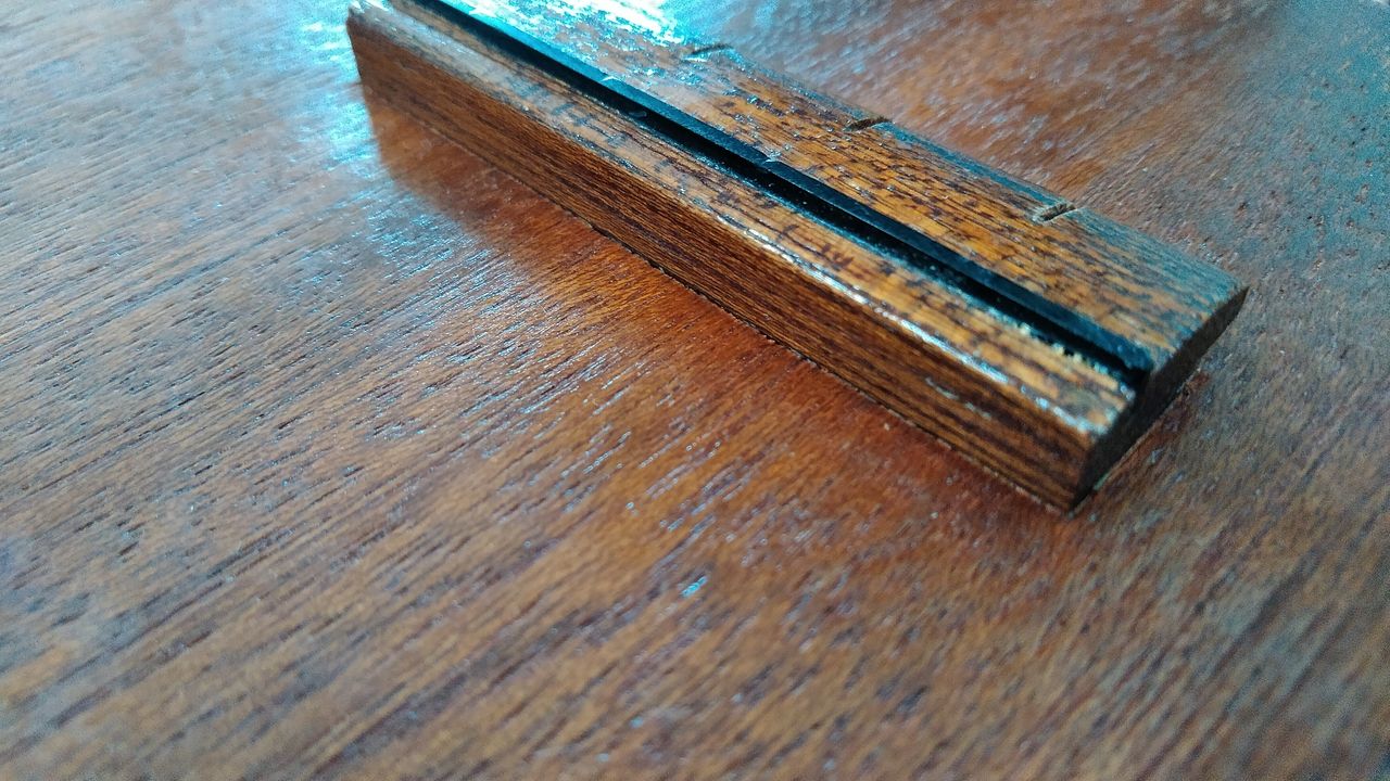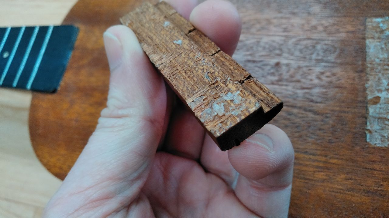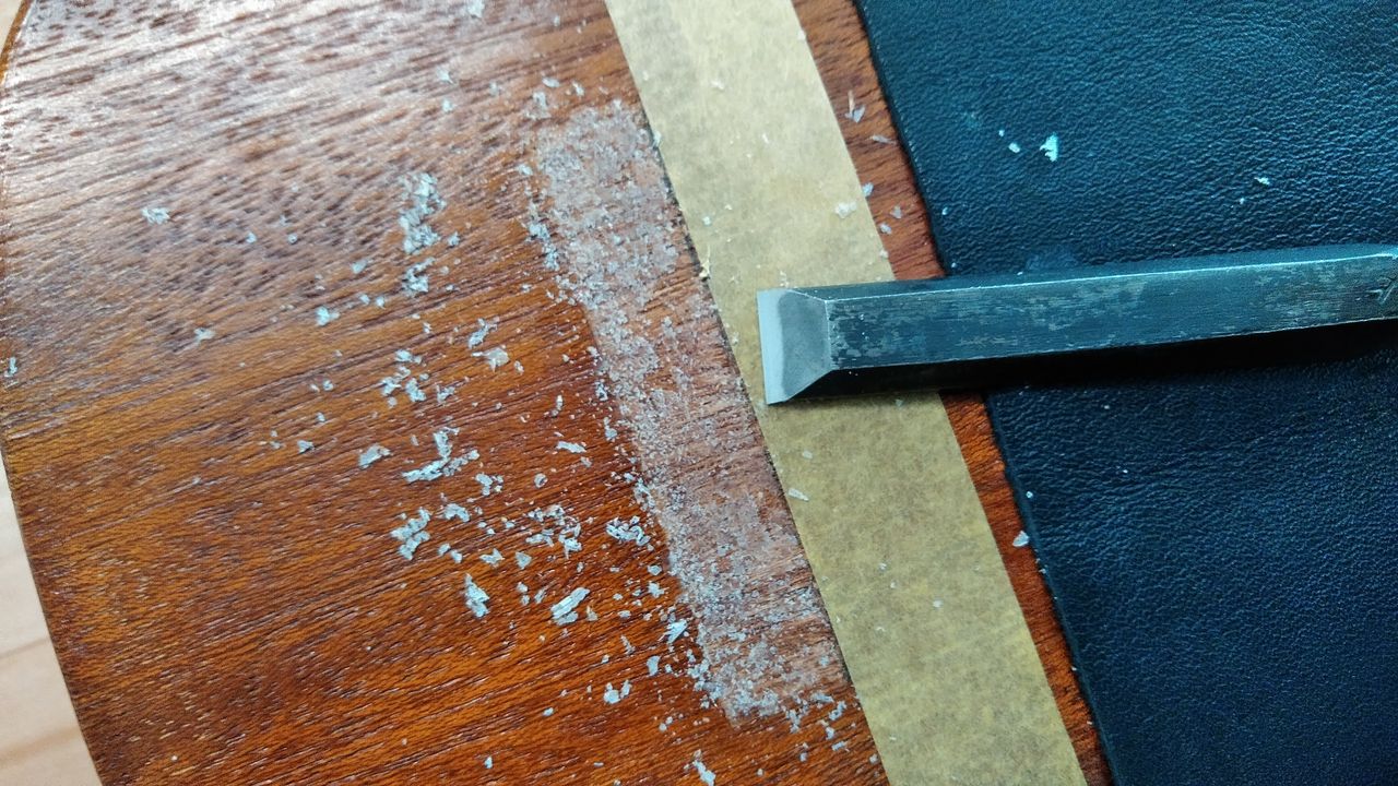 今回はブリッジとサドルが一体の物(接着されている?)でしたので当て木にはサドルを逃がす溝を掘ってます。
