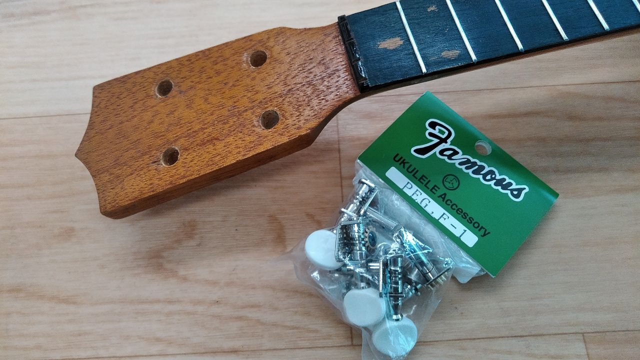 取り付けの加工自体はさほど難しくありませんがペグがスムーズに回り尚且つ綺麗に並べて取り付けるのはちょっとコツが必要です。(いつか説明します)