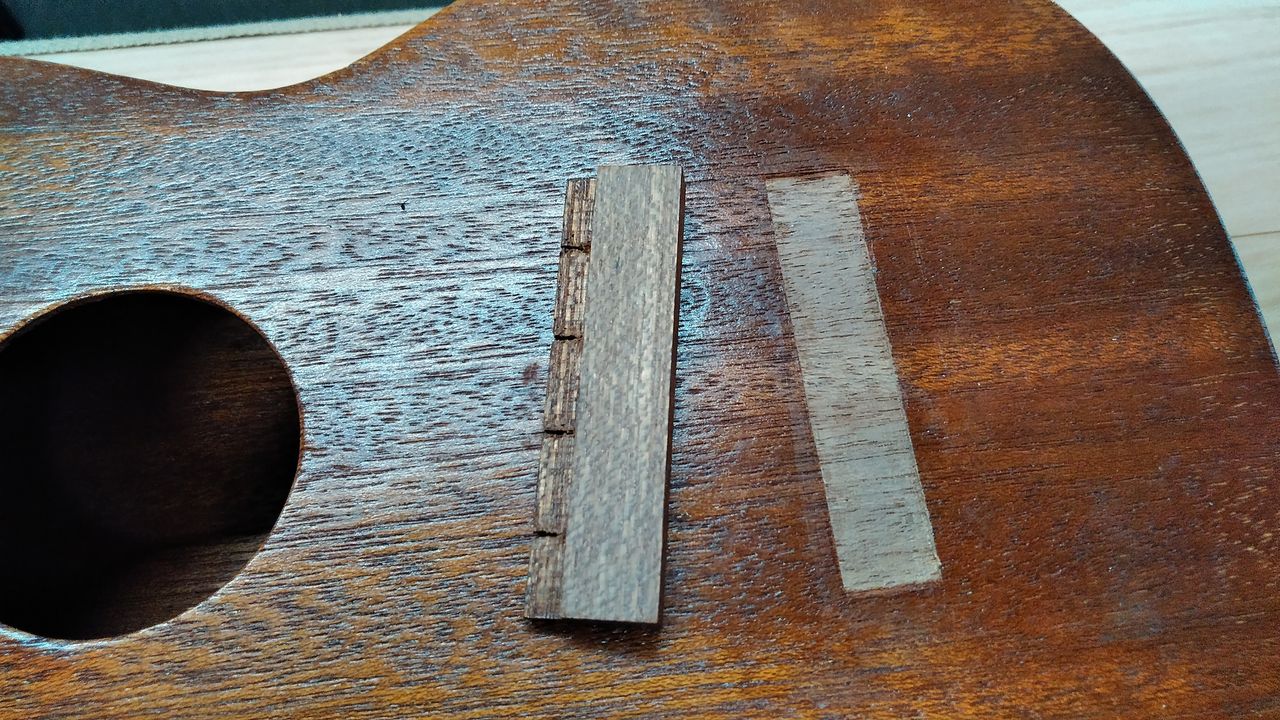 ウクレレはブリッジの面積が小さいのでここまでは割と簡単ですね。