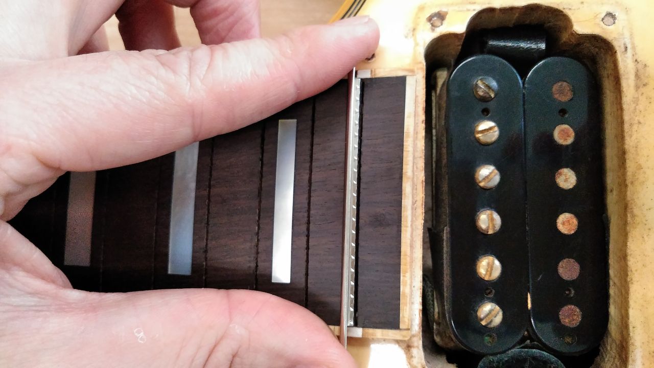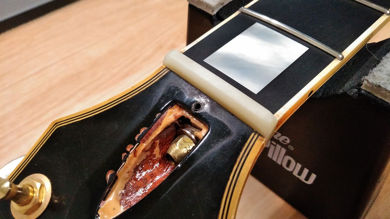 電装系が終わったレスポールはナット交換です。それまでのナットはフレットを抜いた時に外しておりました。