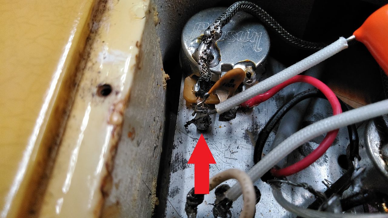 前回フレットが終わったレスポールは電装系のリペアです。コンデンサーとリヤトーンポットが交換、リヤボリュームにハイパスの追加がされているようです。