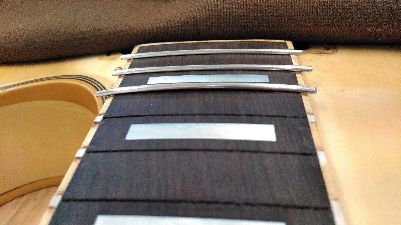 曲げすぎると中央が浮くし、足りないと端っこが浮きます。フレット溝の状態でも曲げ具合が変わるので毎度加減が難しいところです。(続く)