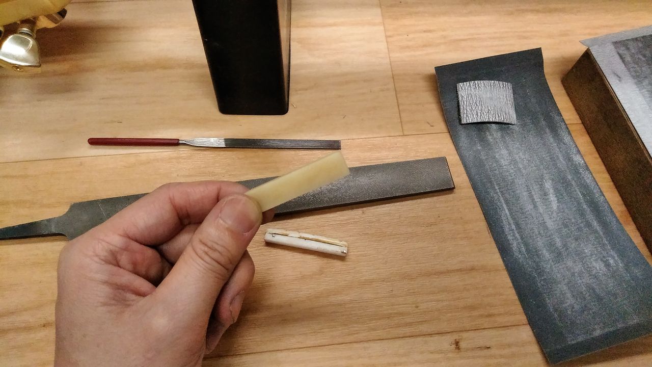 牛骨のブランク材から削りだしていきます。相変わらずくさいのぅ…