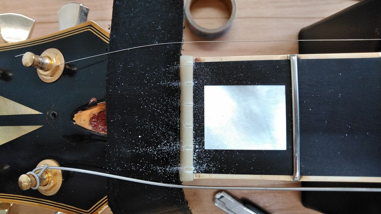 弦の頭が少し出るくらいまで(プレーン弦はすっぽり埋まるくらい)上面を削ったら、全体をペーパーで研磨してコンパウンドで磨き上げてナットは完成です。あとはブリッジ交換を残すのみとなりました。(続く)