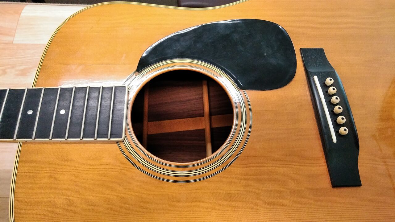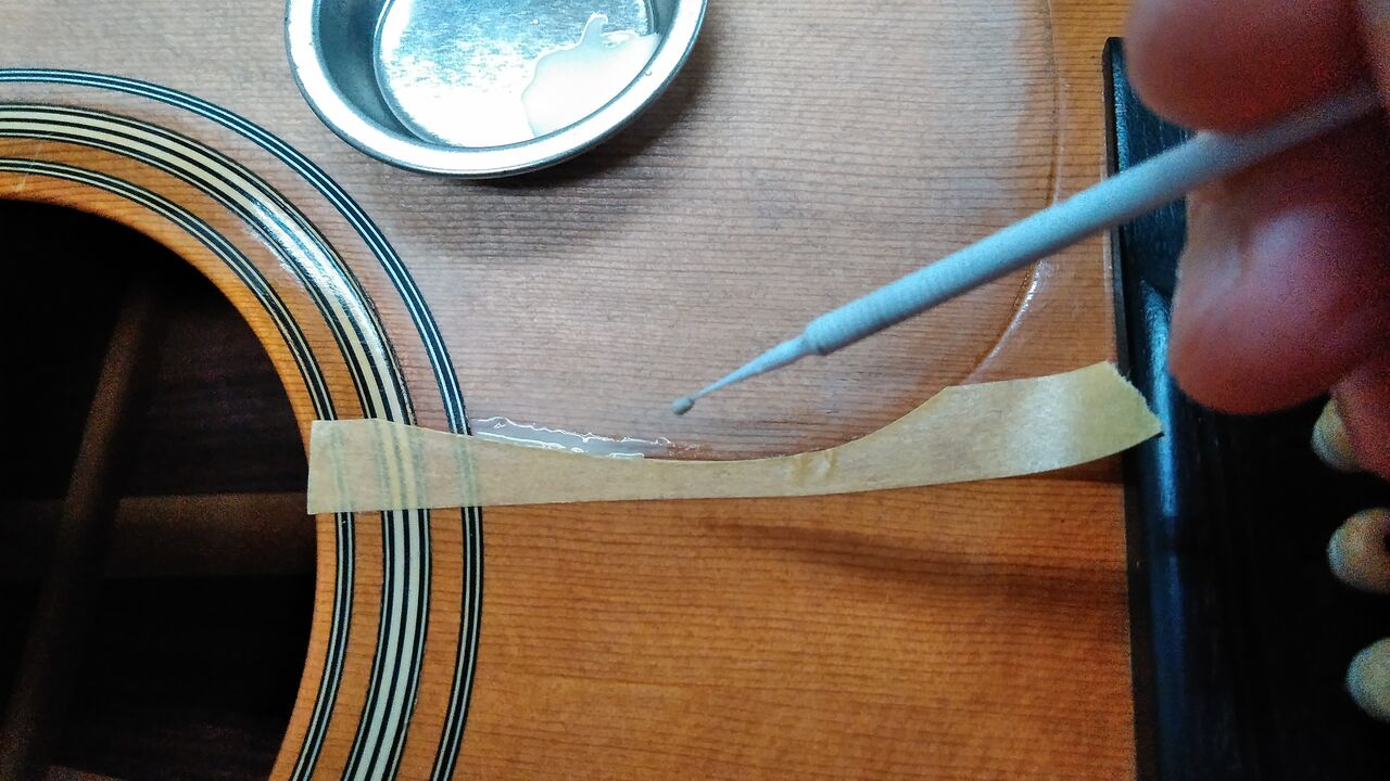 新しく貼るピックガードは両面テープでの貼り付けなので出来るだけ表面を平らにして両面テープがしっかり密着できるようにしておきます。