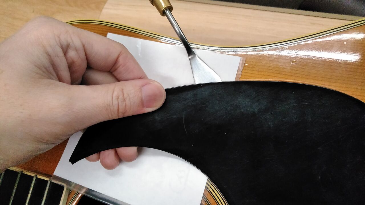 ピックガードは縮んでいくので境目の塗装は勝手に剥がれていきますが、部分的にまだピックガードに乗ってる塗料があるのでカッターで切れ目を入れておきます。これをしないと塗装がチップする事があります。