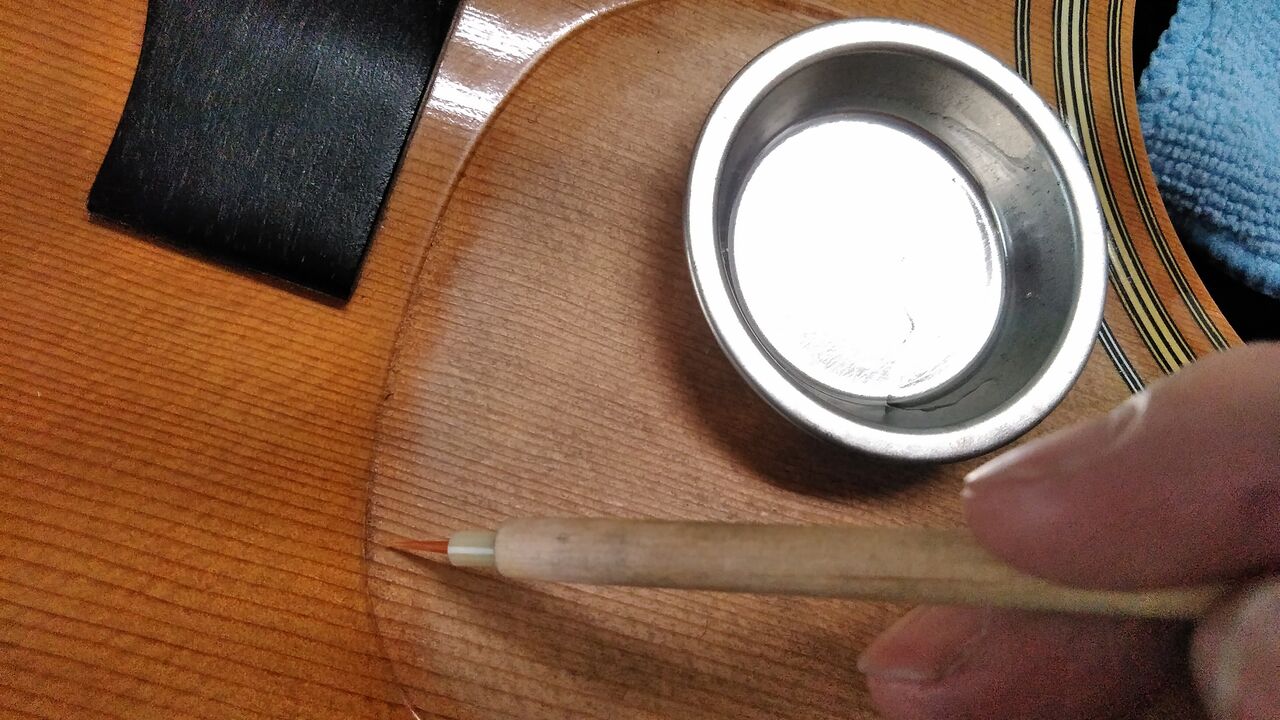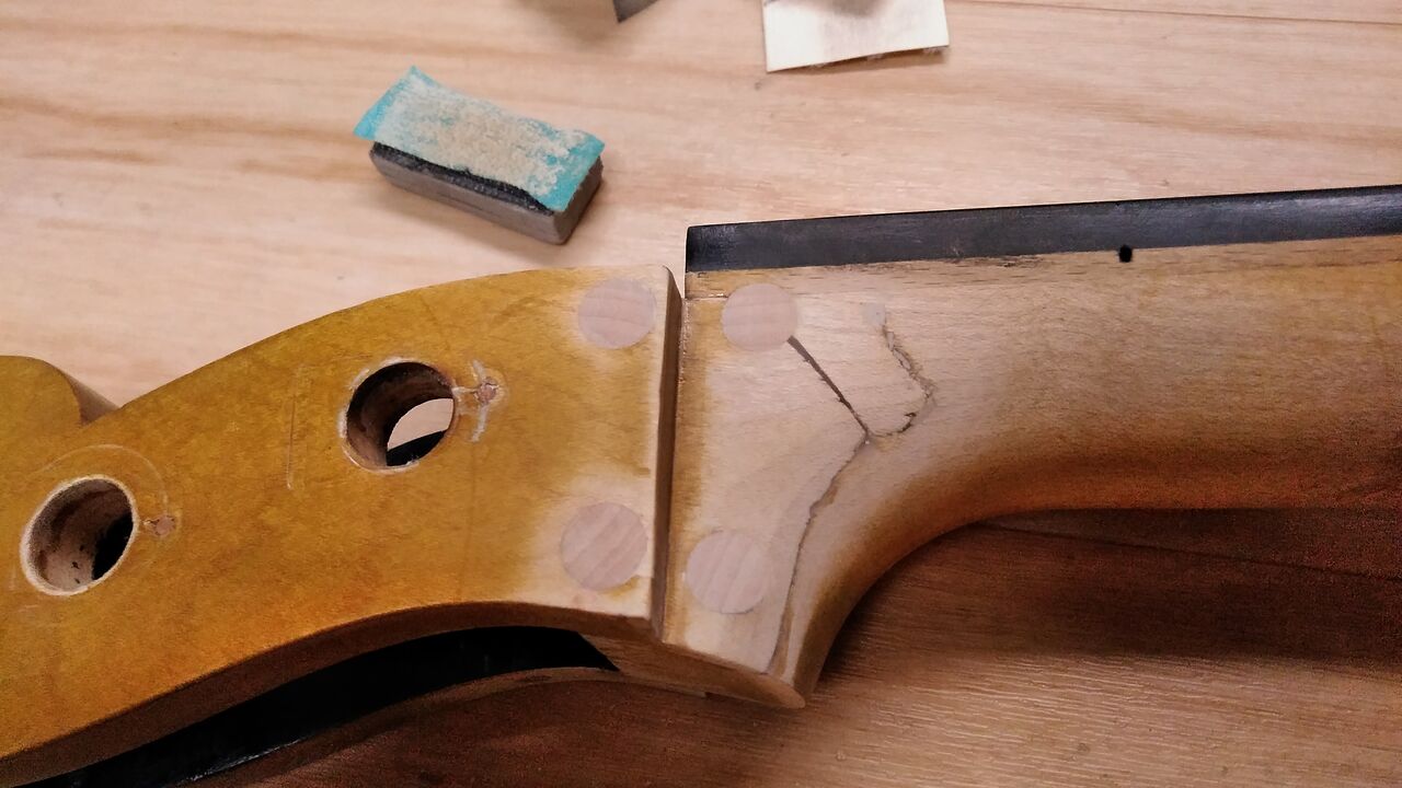 G線側は縦にも割れていたので補強用のダボを埋めてます。画像にはありませんが反対側からも入れてます。内側の黒い部分は後からでは塗装しにくいのであらかじめ塗装してから接着しました。