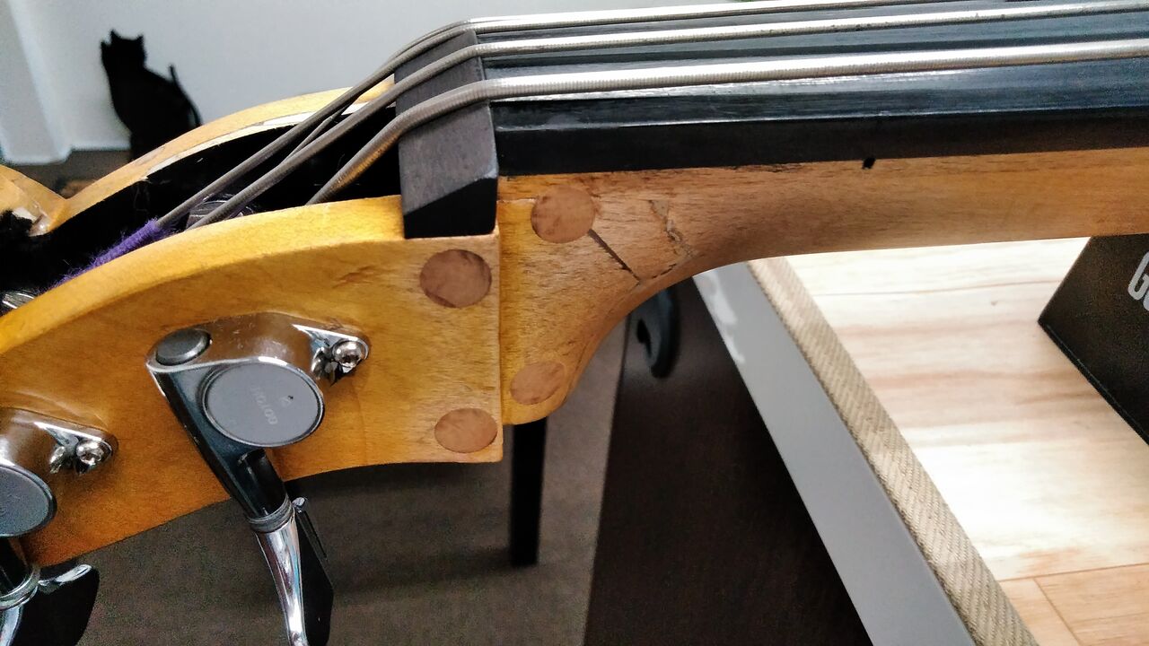 一般的な34インチの4弦ベースで弦の張力は80kgちょっとですが、このアップライトベースだとスケールが長いので100kgを余裕で超えています。(たぶん120kgくらい)