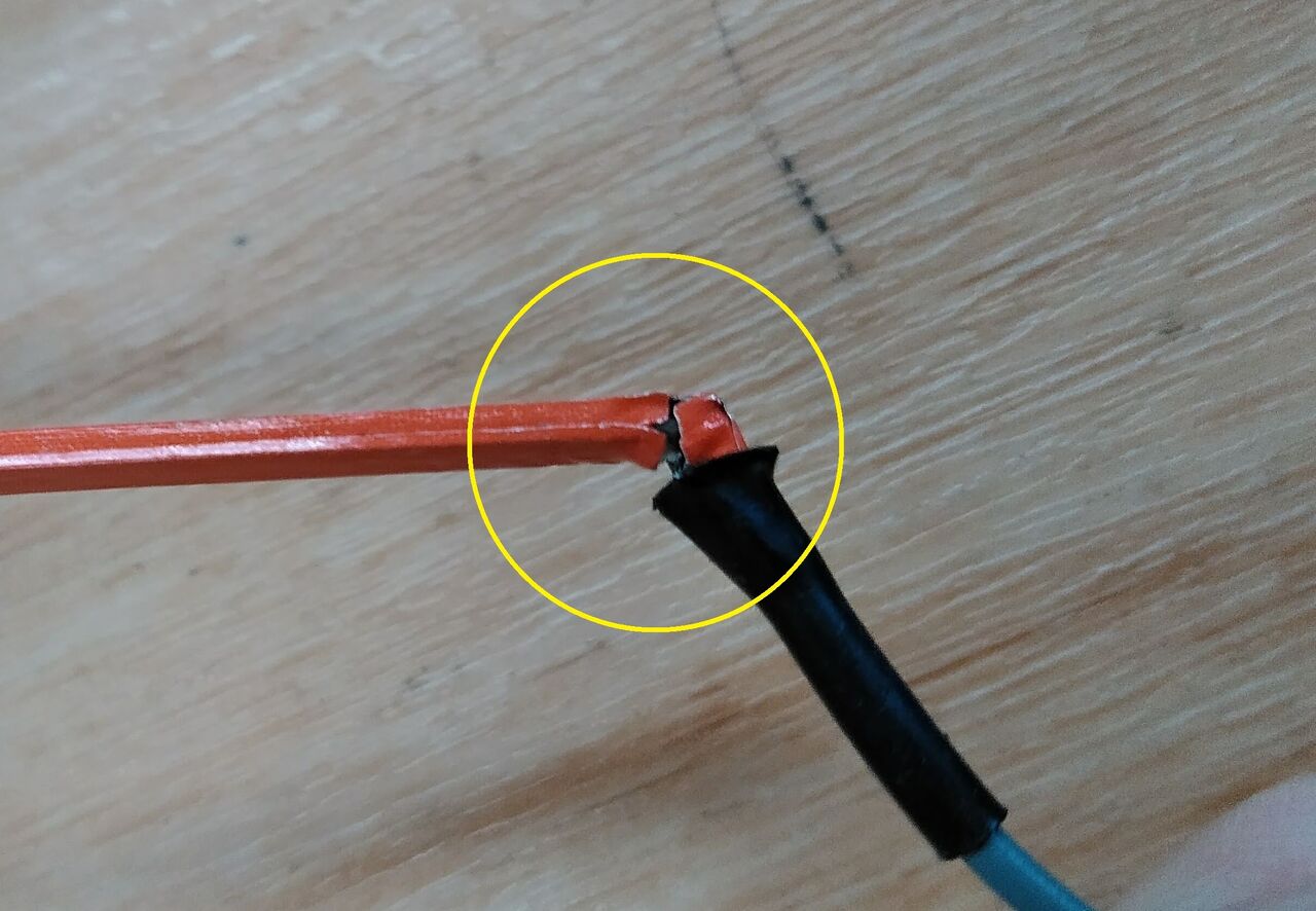 ここで完全に断線しています。このタイプのピエゾの一番弱い所で繋ぎ直すのはほぼ不可能です。