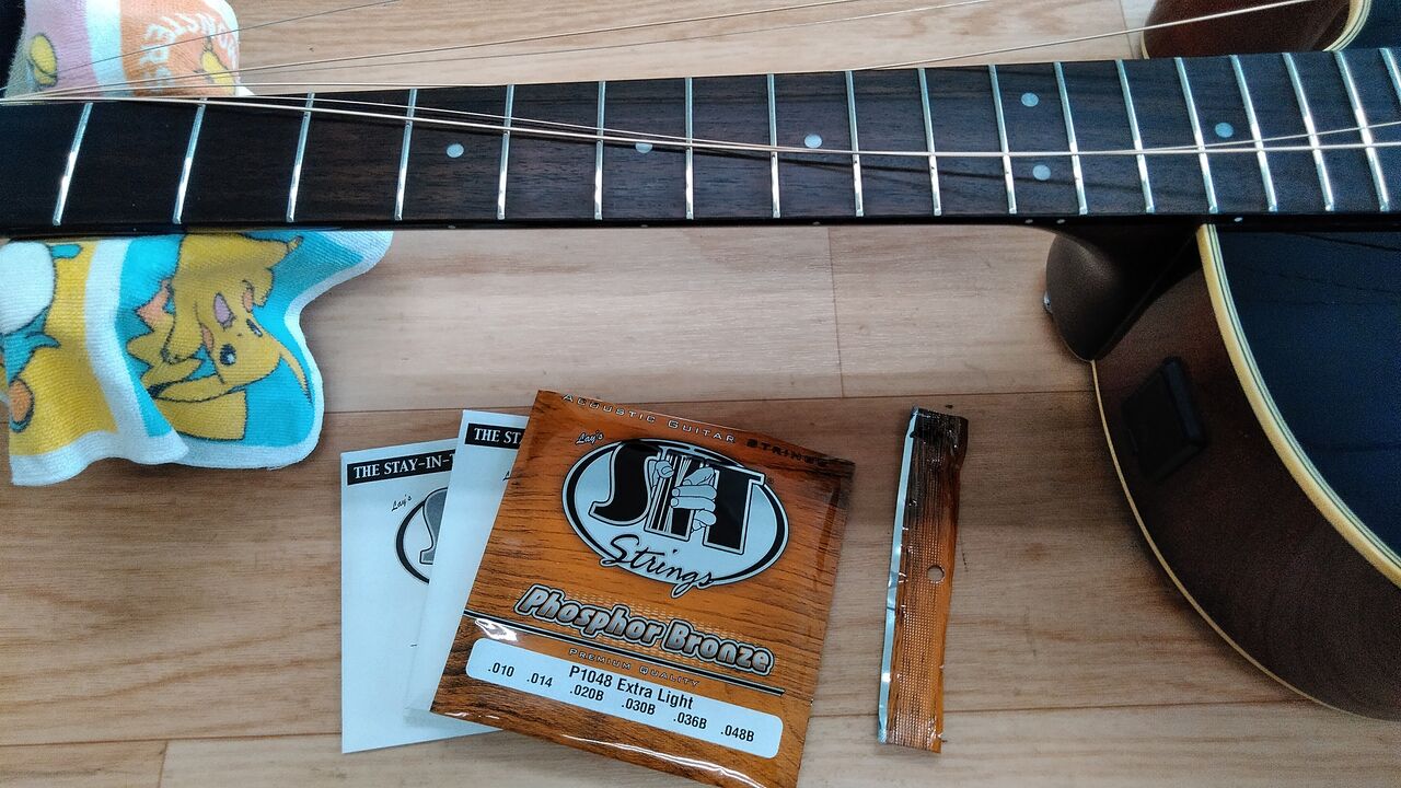 それが終わったら新しい弦を張ります。今回はSITのフォスファーブロンズのエクストラライト(10~48)です。