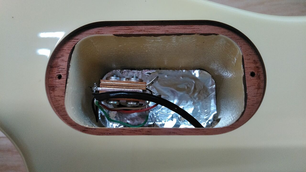 …で、そのEMGを搭載すべく作業中のウルフギャング。ザックワイルド仕様のフロント85、リヤ81のセットです。今回のウルフギャングは木材的にはレスポールと同じですので相性も良さそうです。