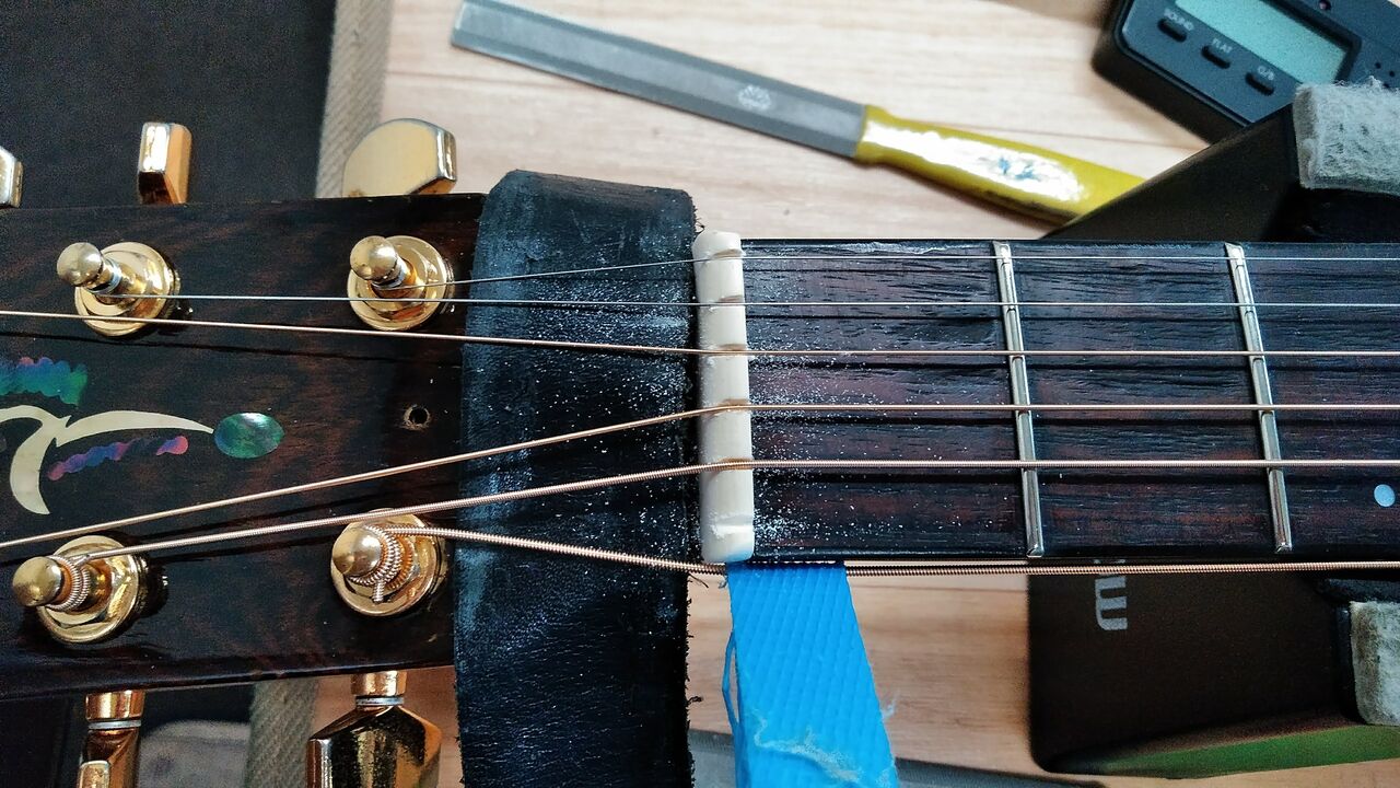 一旦外してナットの上面を落とします。元の弦溝が広めに切られていたのであまり大きく落とすと弦が外れるかも知れません。普段よりは余裕を持たせておきます。