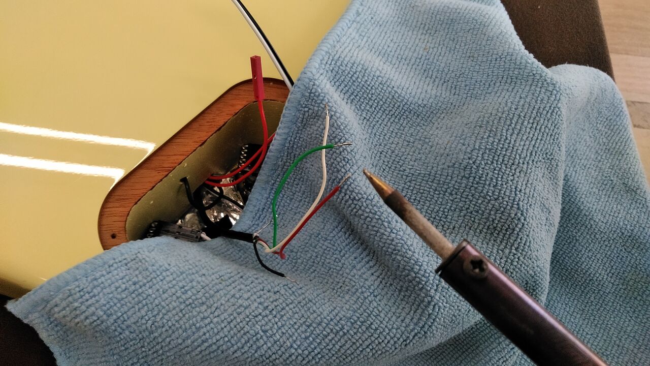 基本ハンダごては使いませんがピックアップセレクターからの配線だけ薄くハンダメッキを施しておきます。