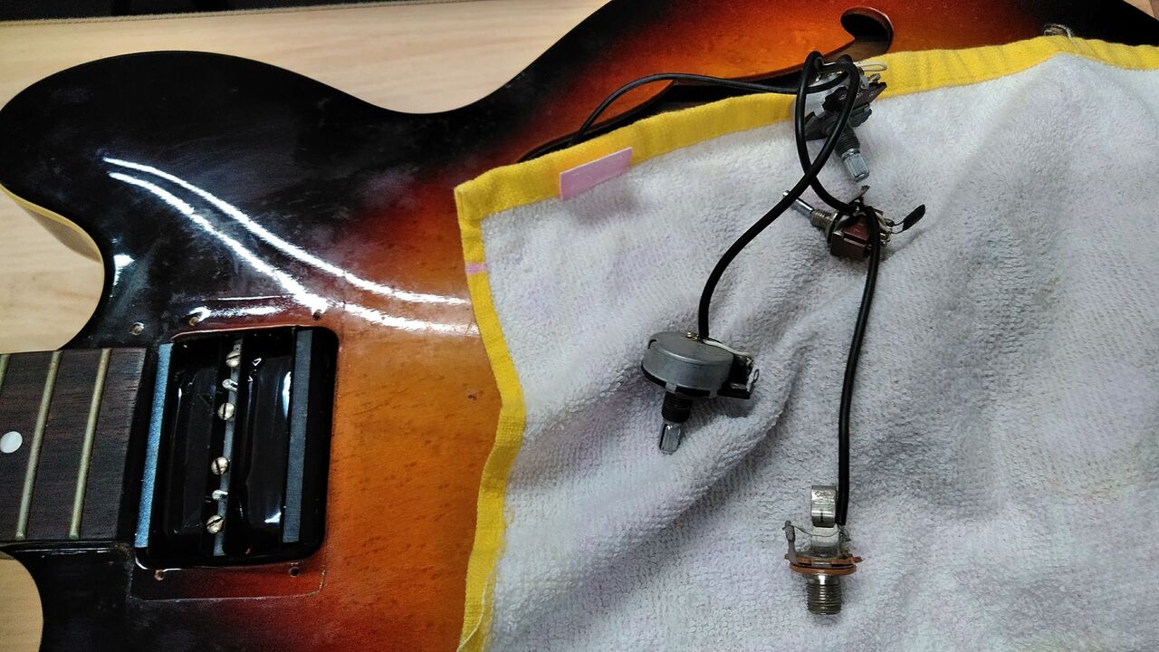 原因を探るべく内部の部品をすべて引っ張り出します。毎度セミアコやフルアコはこの診断するまでが大変です。