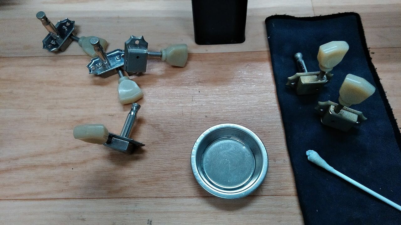 このタイプのペグは漬け置き洗いだと洗浄後の内部のすすぎと乾燥が難しいので表面だけを拭き取ります。今回は指板とフレットがピカピカになる予定ですのでそれに合わせて出来るだけきれいにします。