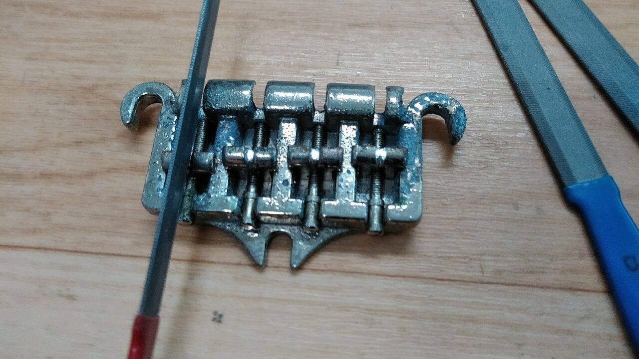 ブリッジは分解洗浄後(いつものマジックリン)サドルを本来の位置に取り付けて弦溝を整えておきます。