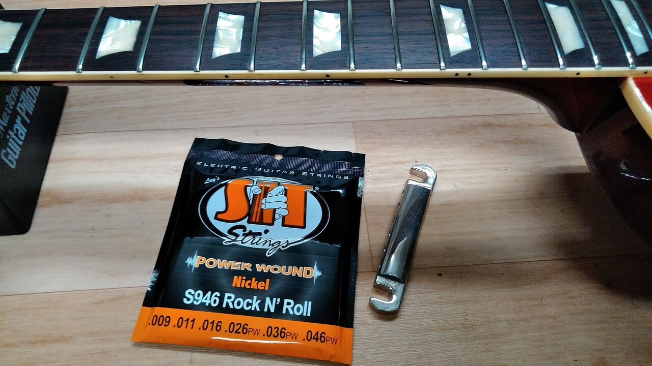 新しい弦を張ります。今回はドロップD(6弦のみ一音下げ)チューニングとのご指定でしたので0946ゲージを使います。