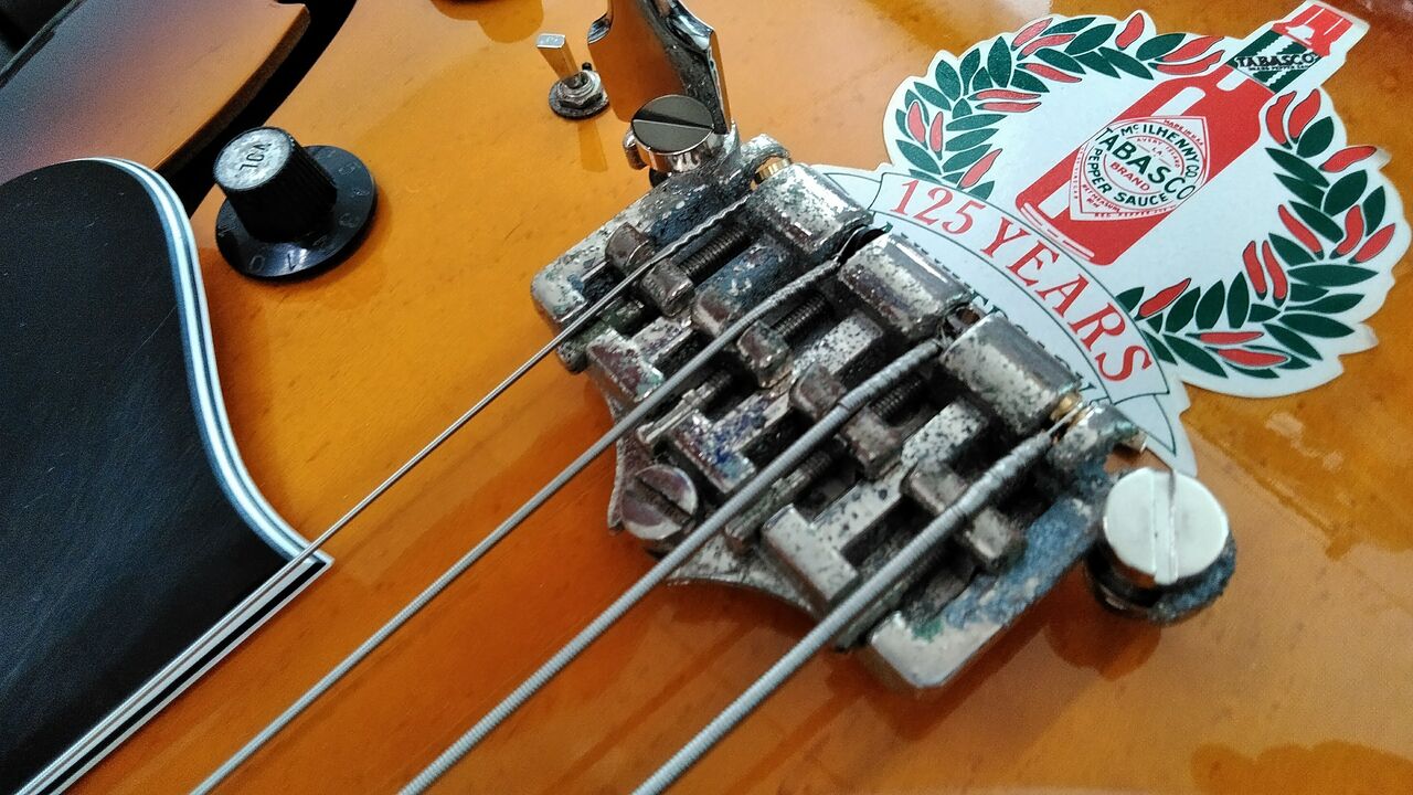 新しい弦を張って弦高調整です。両サイドのスタッドボルトはあんまりにも錆がひどかったので新品に交換しました。錆も故人の思い出ですが今回は楽器としての機能を優先させます。(その錆びたスタッドボルトはもちろんお返しします)
