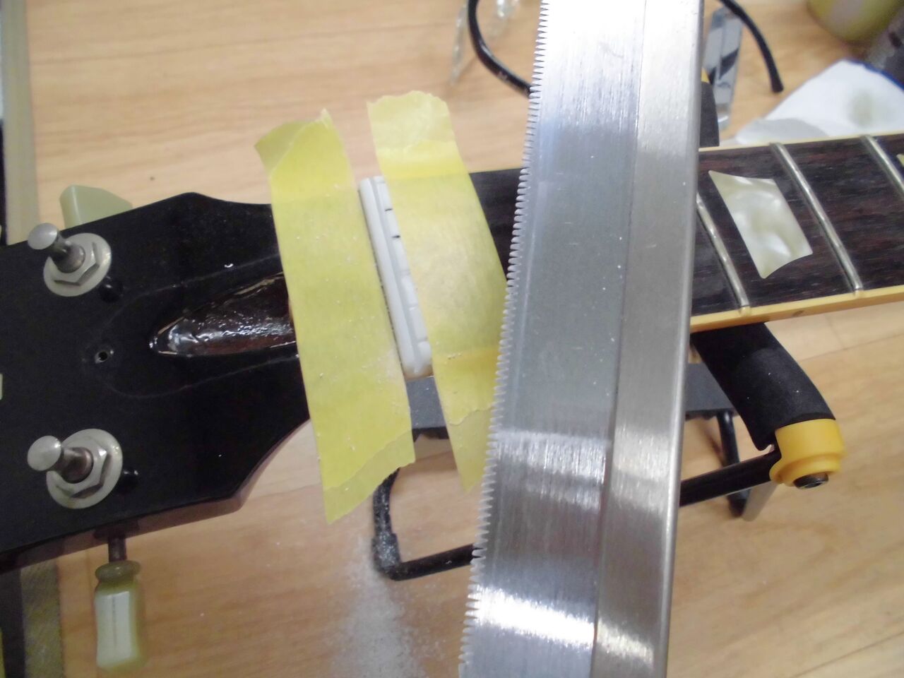 じわじわと底面ギリギリまでノコを入れます。うっかりネック側まで切らないように細心の注意で切っていきます。