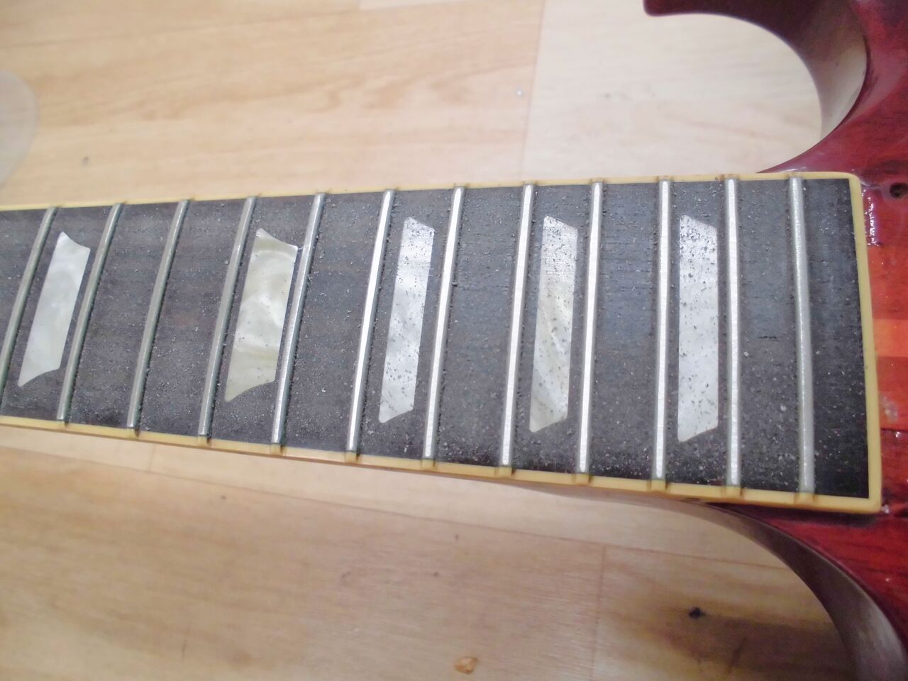前回ナットを外したSGはフレットのすり合わせ作業に入ります。個人的にナット交換は非常に神経を使うので最後にしています。(ナットを仕上げた後はもう仕事したくないから)