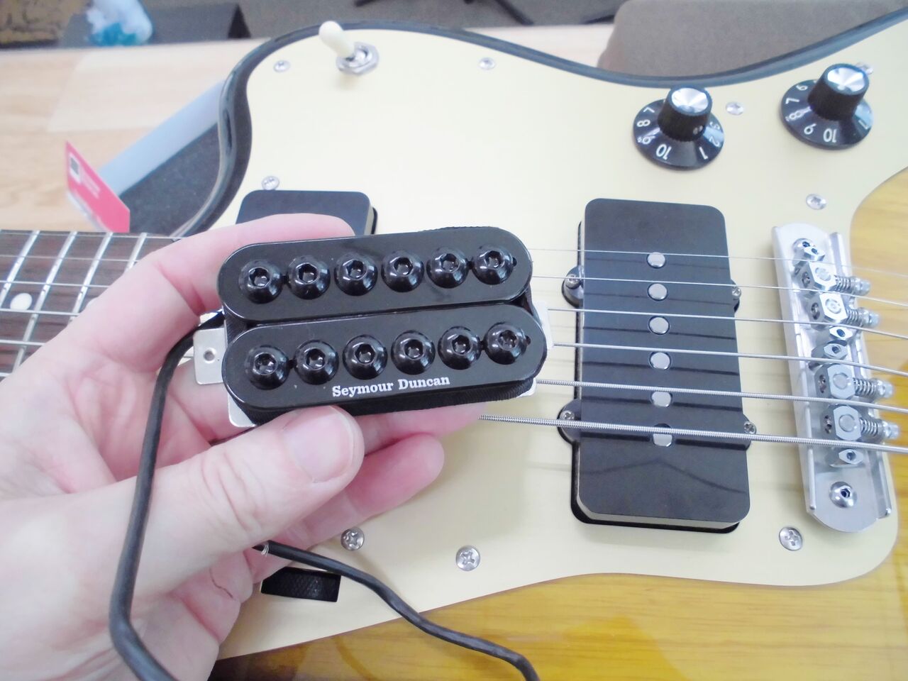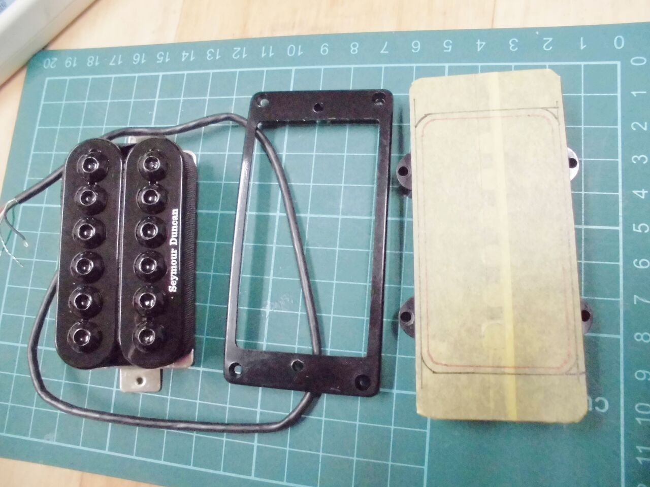 やはりハムバッカーが最適であろうという事で今回交換するのはお持ち込みのセイモアダンカンSH-8、通称インベーダー。いかつい見た目通りのハイパワーピックアップです。