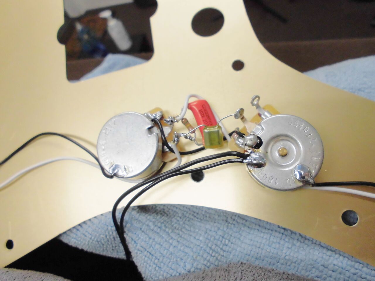 プリセットスイッチをキャンセルしたのでシンプルな配線になりました。ボリュームにはスムーステーパーのためのコンデンサーと抵抗を追加しています。少し触っただけで大きくボリュームが下がるのにお困りのご様子でした。
