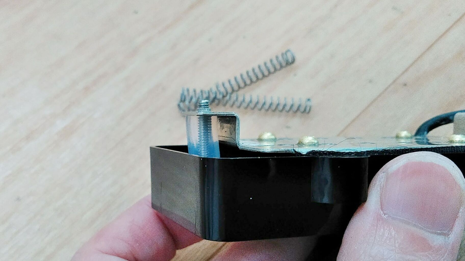 ピックアップを吊るすスプリングはシリコンチューブに変更しました。ピックアップの高さ調整はこのネジでは行いませんのでシリコンチューブの方がよりソリッドに固定できてスプリングの共振も無くせるので好都合です。
