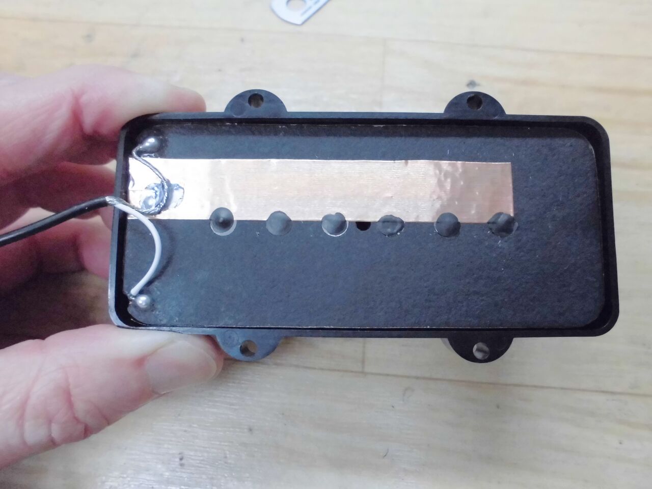 銅箔テープでピックアップの側面と上面をシールドします。銅箔テープ同士が導通するように繋ぎ目はごく少量のハンダで止めておきます。