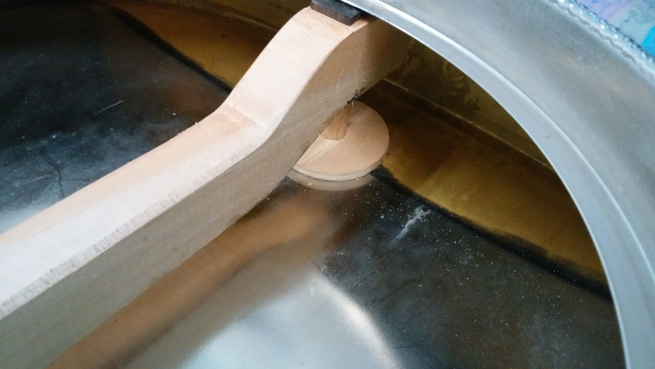 あとは内部の点検です。リゾネーターギターの特徴であるコーン(共鳴板)が内部に仕込まれています。非常に薄いアルミ板で出来ているのでうっかり曲げたり潰したりしないよう細心の注意が求められます。