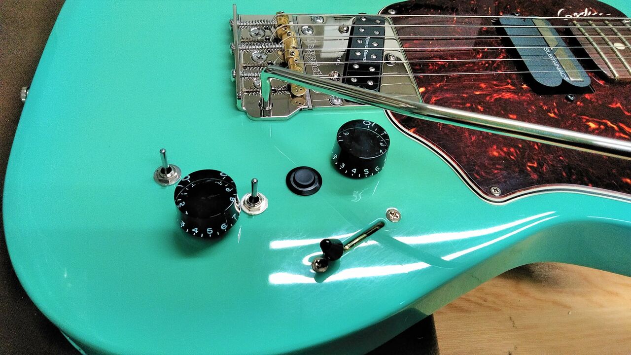 キルスイッチはマスターボリュームとアウトプットジャックの間に入れてます。スイッチ類の配置がやや強引ですがもうここしか思い付きませんでした。