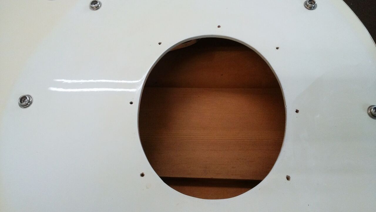 今回はピックアップも含めて電装パーツをすべて交換のご依頼もいただいております。毎度ハコ物の電装回りは億劫になるのですがこのギターにはメンテナンスホールがあります。