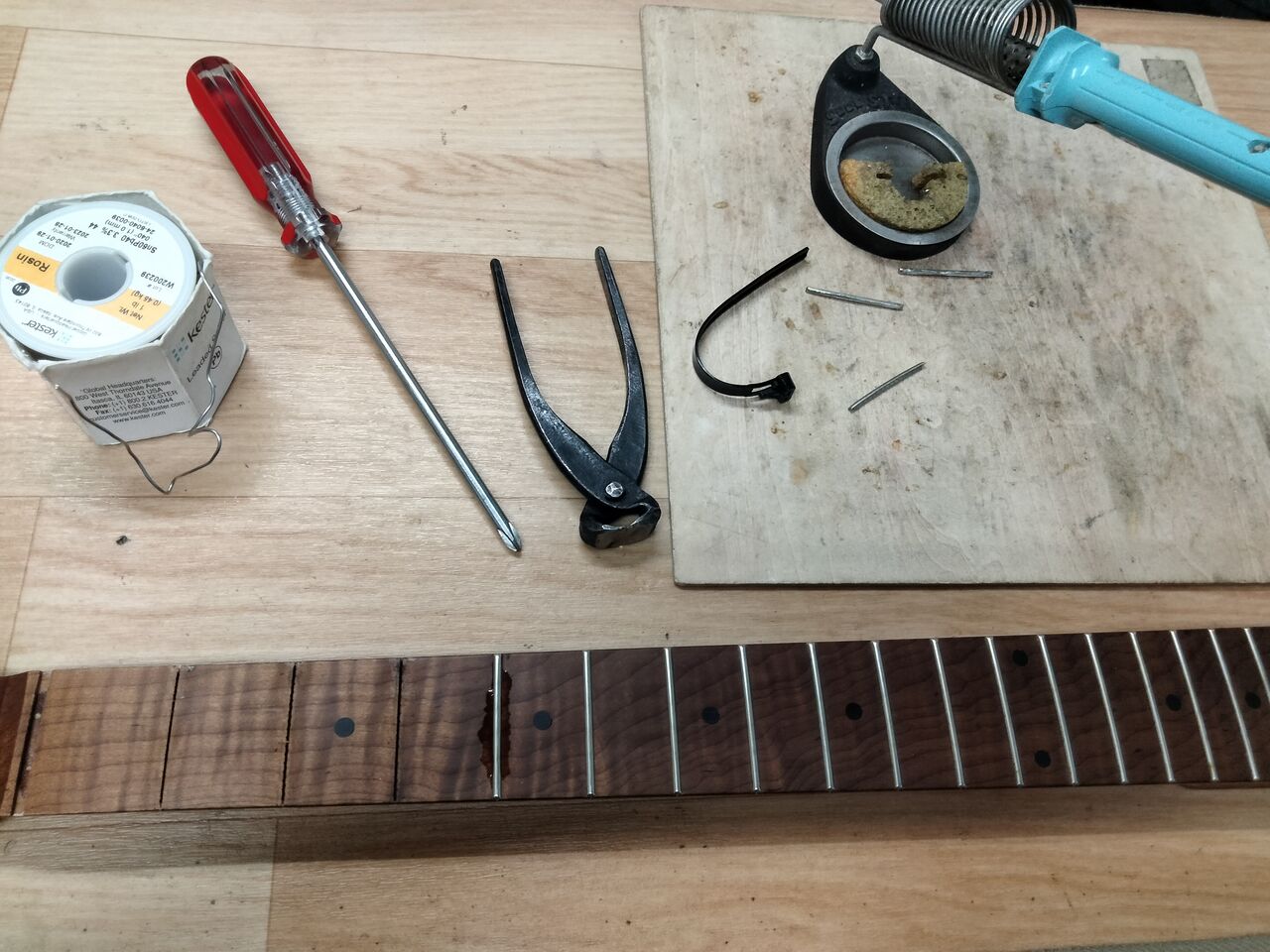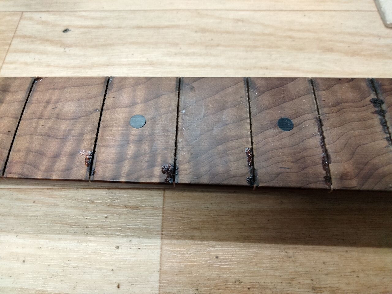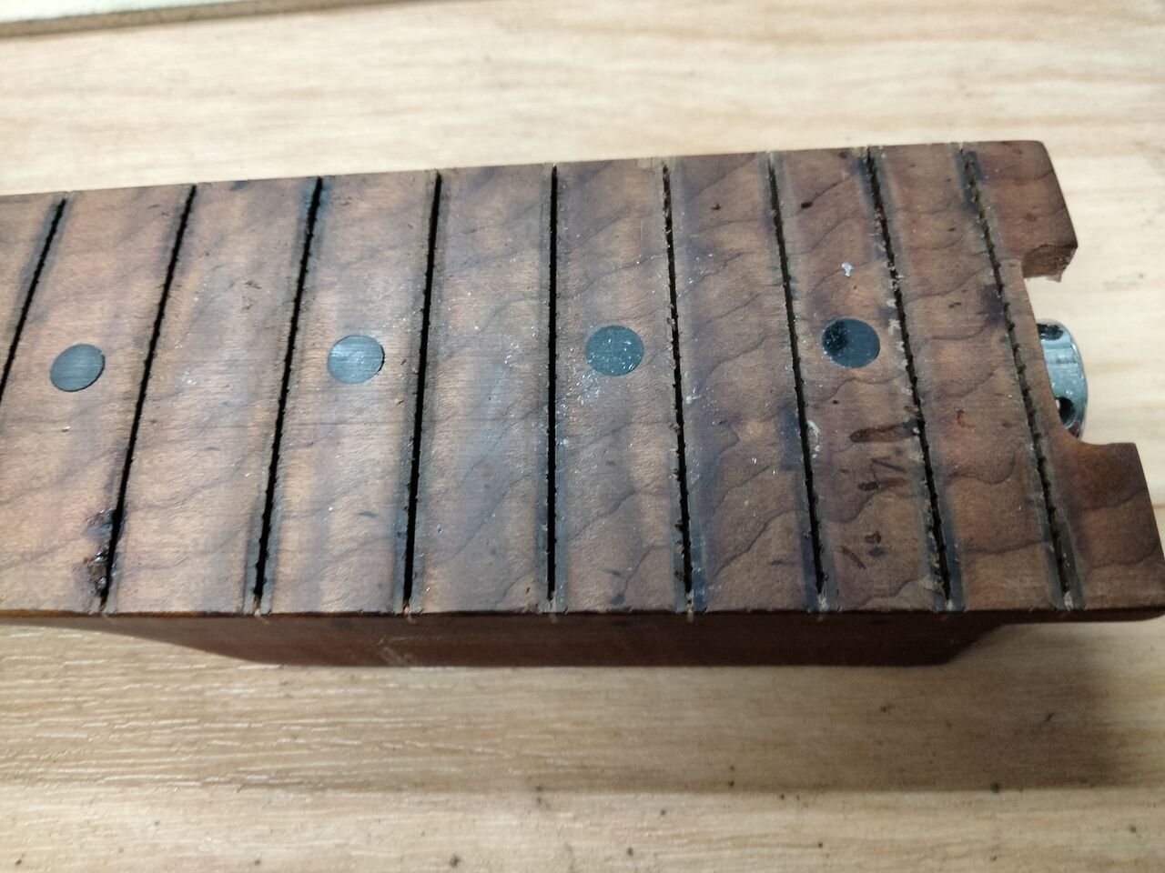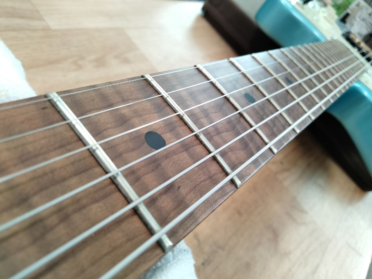 実はローステッドメイプルのフレット交換は今回が初めてです。ハンダごてで熱を入れながらいつも以上に慎重に抜いていきます。(熱を入れるとメイプルシロップの美味しそうな匂いがします