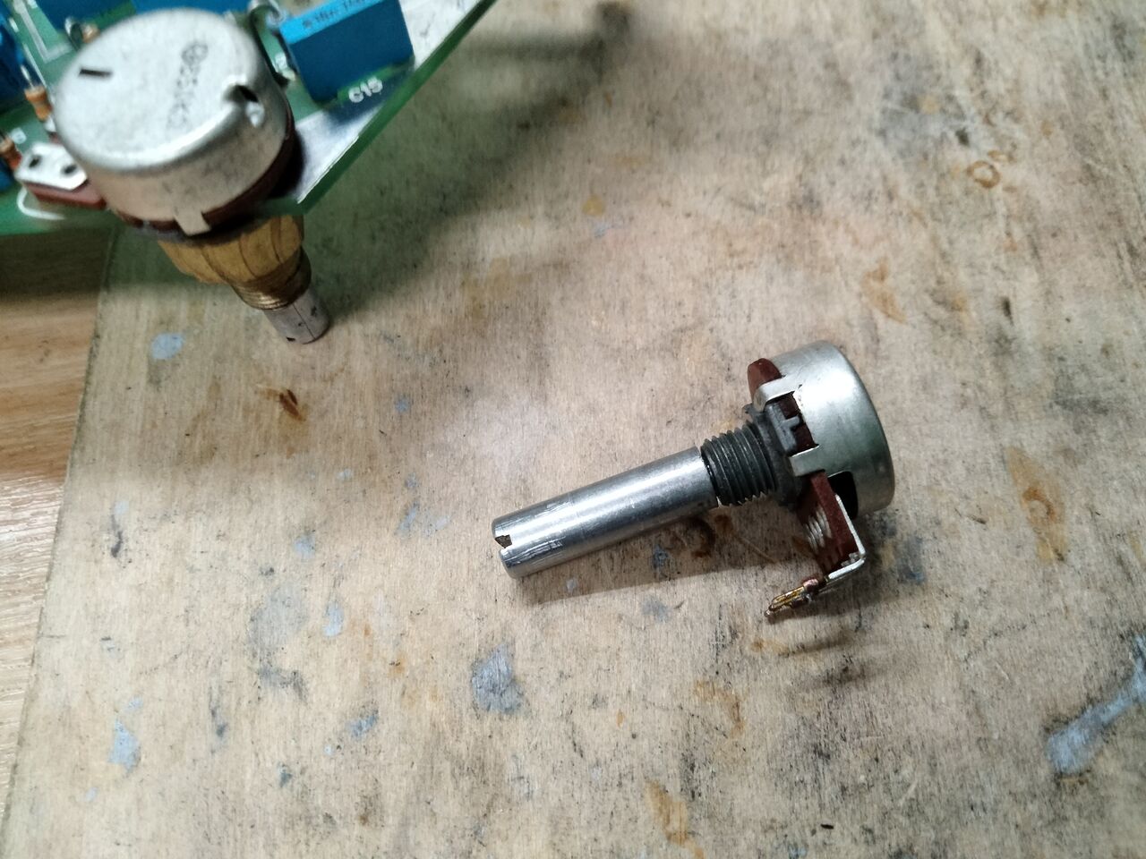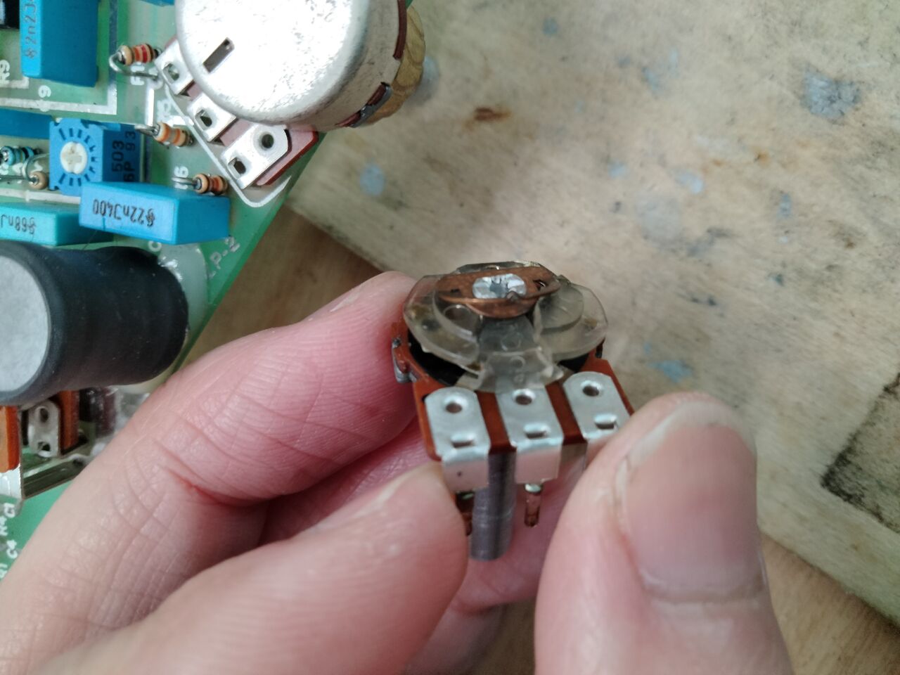 この3つ並んでるポットの真ん中ですね。当時のリペアの時もガリノイズが消えず苦戦した覚えがあります。